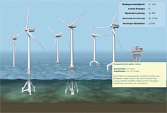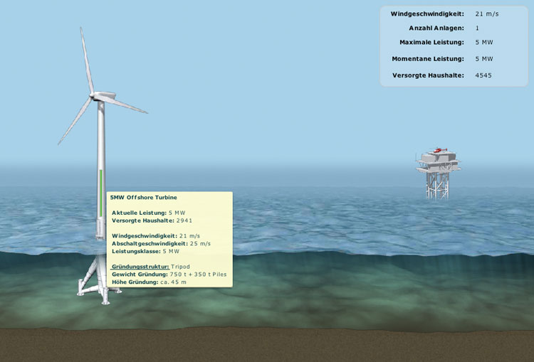 Die Besucher haben die Möglichkeit virtuelle Windenerieanlagen zusammenzubauen und auf See zu positionieren und im Anschluss die Windgeschwindigkeit zu steuern. Hierdurch wird ihnen ein Gefühl für die produzierten Energiemengen und die damit versorgbaren Haushalte gegeben. Screenshots: ![]() ![]() ![]() ![]() |