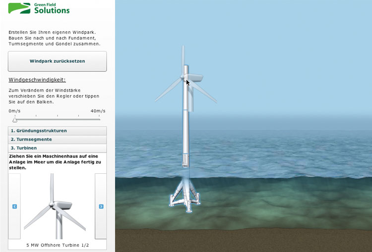 Der Wind Park Builder wurde für die Ausstellung "Faszination Offshore" der Stiftung Offshore Windenergie entwickelt. Ziel der Applikation war es den Besuchern die Dimension und den Energieertrag eines Windparks auf See näher zu bringen.